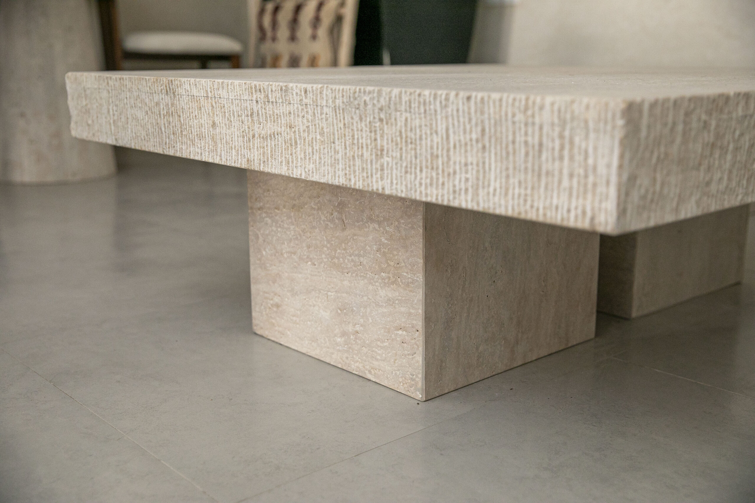 Découvrez nos tables, consoles et pièces sur mesure façonnées avec passion, où design contemporain et artisanat s’unissent pour sublimer la beauté du travertin.